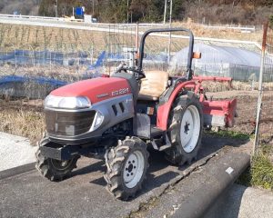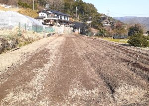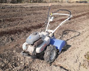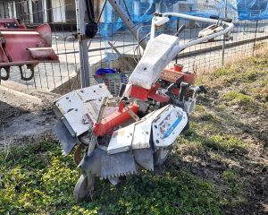 その後は畝作りです。棒と巻き尺を使って線を引き、それに沿って管理機(⑤)で浅い溝を作っていきます。両サイドに土が飛ばされるようになっており、溝の横に土が盛り上がって畝となります。50mの溝上げするのに15分ほど、手作業との差に啞然です。今回は6本の畝ができました。そこにたい肥を入れていきます。近くの畑から一輪車で運び、1畝につき2車分ほどをスコップで移していきます。それが終わると次はミニ耕運機(⑥)の登場です。畝の上に乗り入れ耕運して土を更に細かくしていきます。たい肥も一緒に混ざり、ふかふか2歩手前ぐらいになりました。最後にレイキ(③)で畝を均して完成です。今後野菜を作り続けながら良い土にしていきます。