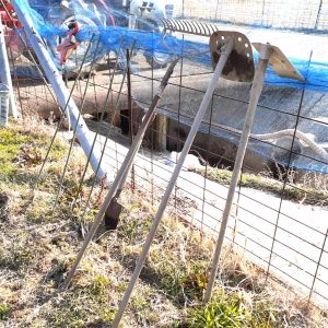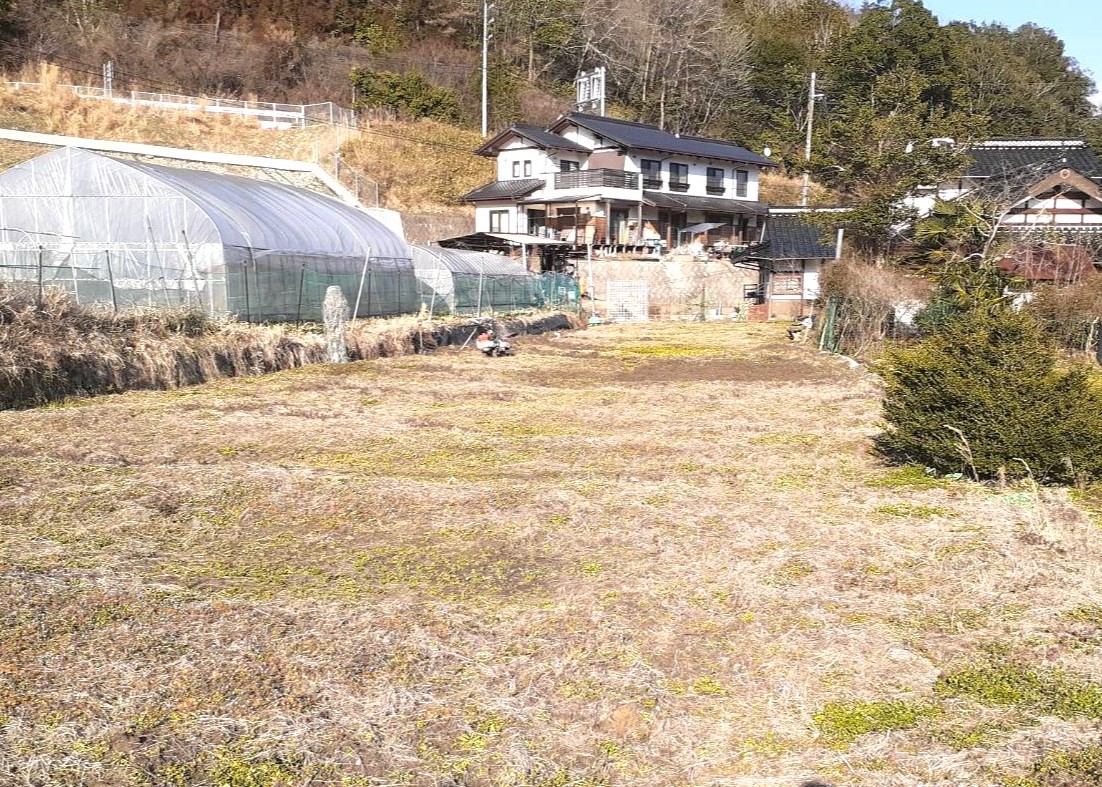 そんな中、耕作放棄地だった近くの田んぼをお借りして畑にすることにしました。幸い昨年末に草刈りはしてあったので、畑の外側に沿った排水用の溝作りからスタートです。縦に長い圃場で50m強をスコップと平鍬(①)、鋤簾(②)を使ってひたすら幅広の溝を作っていきます。(隣の畑の石垣が近く機械が使えず、泣)6時間ほどで完成しました。