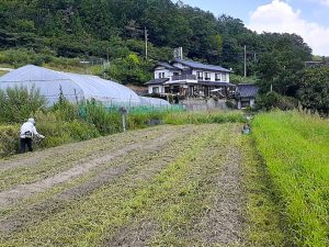 カボチャの収穫と並行して行っているのが、秋冬野菜の植え付け準備です。まずは、前作後にそのままにして草原と化した畑の草刈りから。草刈機の軽快なエンジン音が朝の山谷に響きます。それを聞きつけたか、赤とんぼがどんどん集まってきます。写真では見えないのが残念なのですが100匹以上飛び回っています。草を刈った時に飛び立つ羽虫を食べに来ているのですね。カエルもあちこちから飛び出てきます。それを狙うのはトンビ。10mほどの上空を旋回しながら品定めをしています。急降下してきて足で掴もうとするのですが、、、結構失敗しています(笑)。頑張れ!
