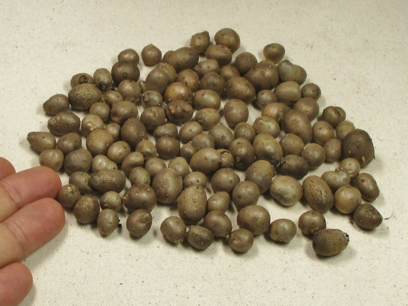 同じツルに出来ても大きさはまちまちで、大きいものは親指の先大~小さなものは小豆大ほど。灰褐色の薄皮の中は、ちょっと食感のしかっりした、水分の少ないヤマイモといった感じ。ぬめり気もあります。