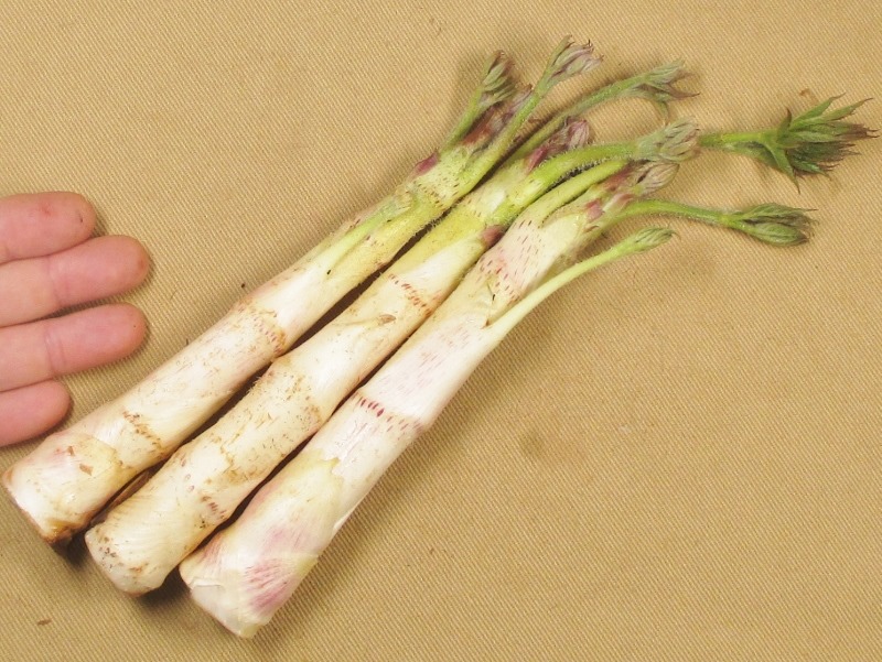 この時季限定のウド(独活)ですが、食用となるのは若い茎や穂先だけで、青々と成長してしまったものはアクが強く食用には向きません。完全に遮光して作られる「軟白うど」と、ある程度日光にあて緑色がかった「山うど」があります。今日出荷されたウドは、もみ殻をこんもりと盛って遮光し栽培されたものです。春の山菜特有の風味とシャキシャキした歯触りが特徴です。アクがあるので皮をむいて酢水につけ酢味噌和えにしたり短冊に切って天ぷらにしても美味しいですよ。皮も一緒に細く刻んでキンピラにするのもお勧めです!季節の味を是非どうぞ。