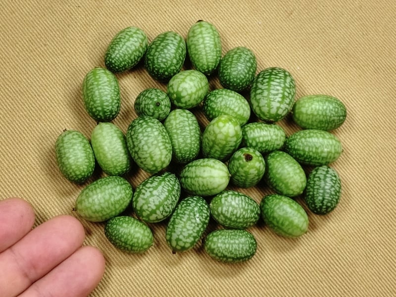 楕円形でスイカ風の模様…品種名には『サワーガーキン』とついていて、なんと!これは、驚くほど小さく可愛い親指ぐらいのキュウリです。